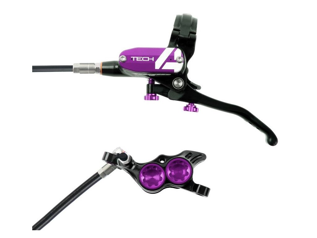 Brzdy Hope Tech 4 E4 - 4-pístkové lehké a výkonné Enduro brzdy ve fialovém provedení.