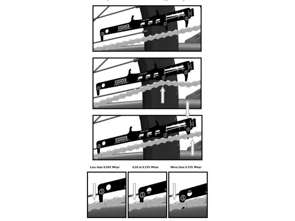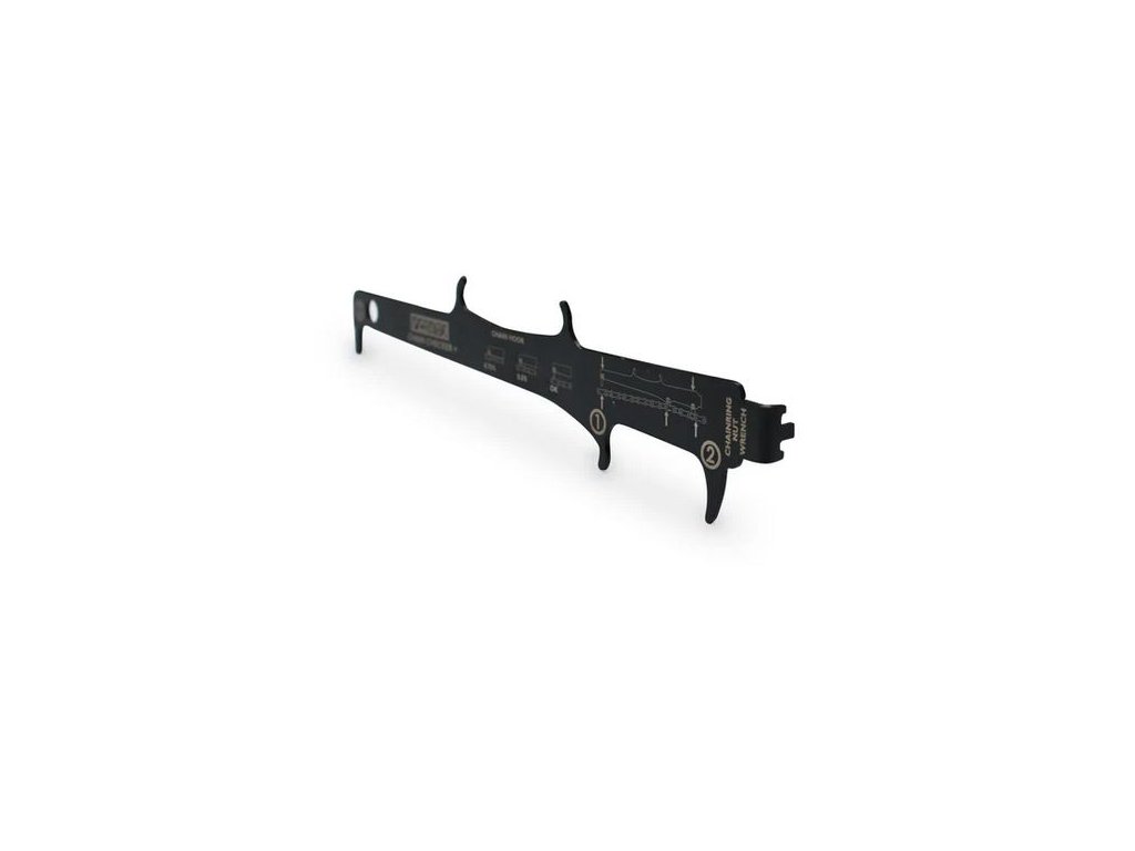 Přesná profesionální měrka k rychlé kontrole opotřebení (prodloužení) řetězu jízdního kola. Správná poloha měrky je fixována přitlačením válečku řetězu na čep řetězu, tzn. stejně jako při namáhání řetězu tahem za zuby převodníku/pastorku.